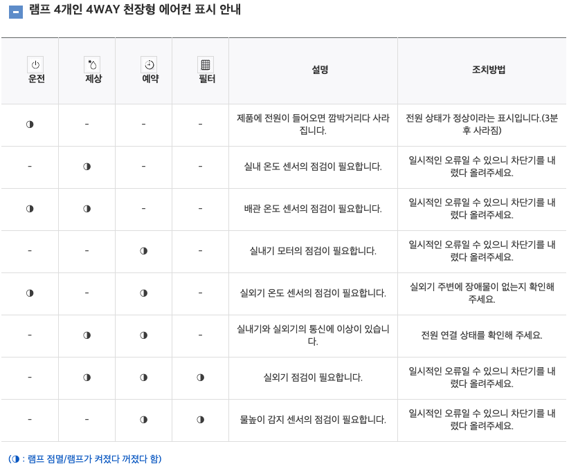 나의 경우는 전원(운전) LED를 제외한 나머지 3개가(제상,예약,필터) 점멸하는 증상이 계속 나오는 상황으로