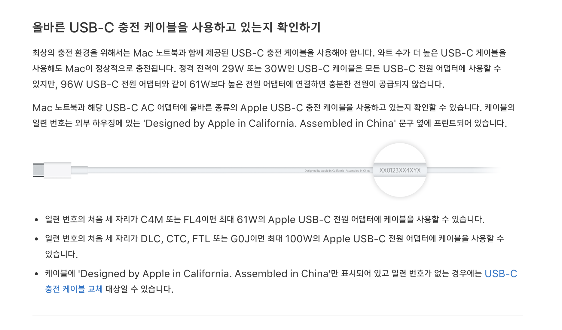 시중의 값싼 USB-C 충전 케이블은 어댑터에 꼽아도 96W 충전이 지원이 안될 가능성이 있다고 하니 확인 해보고 구입하자