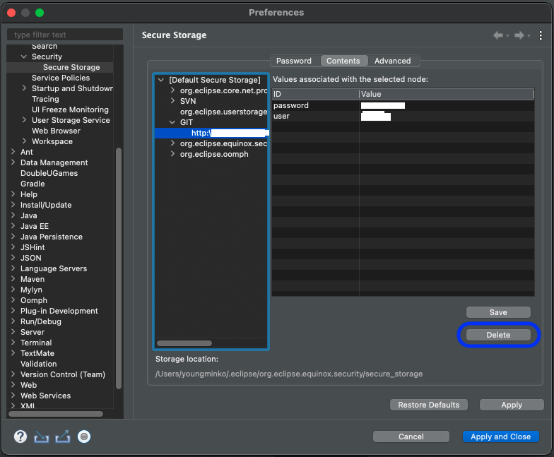 위의 방식으로 해도 동일한 오류가 발생한다면 아래 이미지 처럼 Contents 에서 GIT 에 저장된 계정정보를 선택해서 Delete 해주면 된다고 한다.
