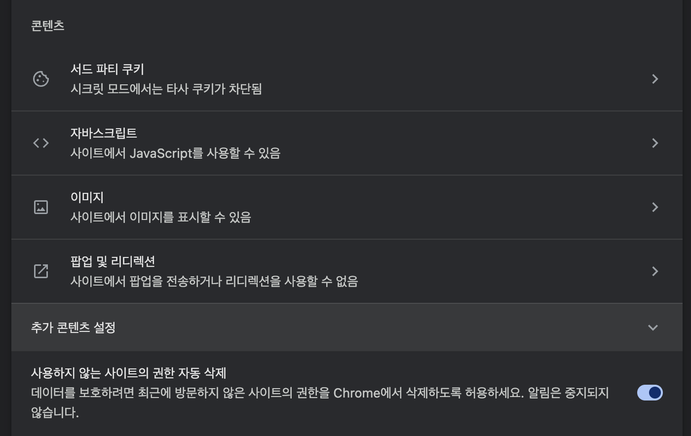 사이트 설정 > chrome://settings/content