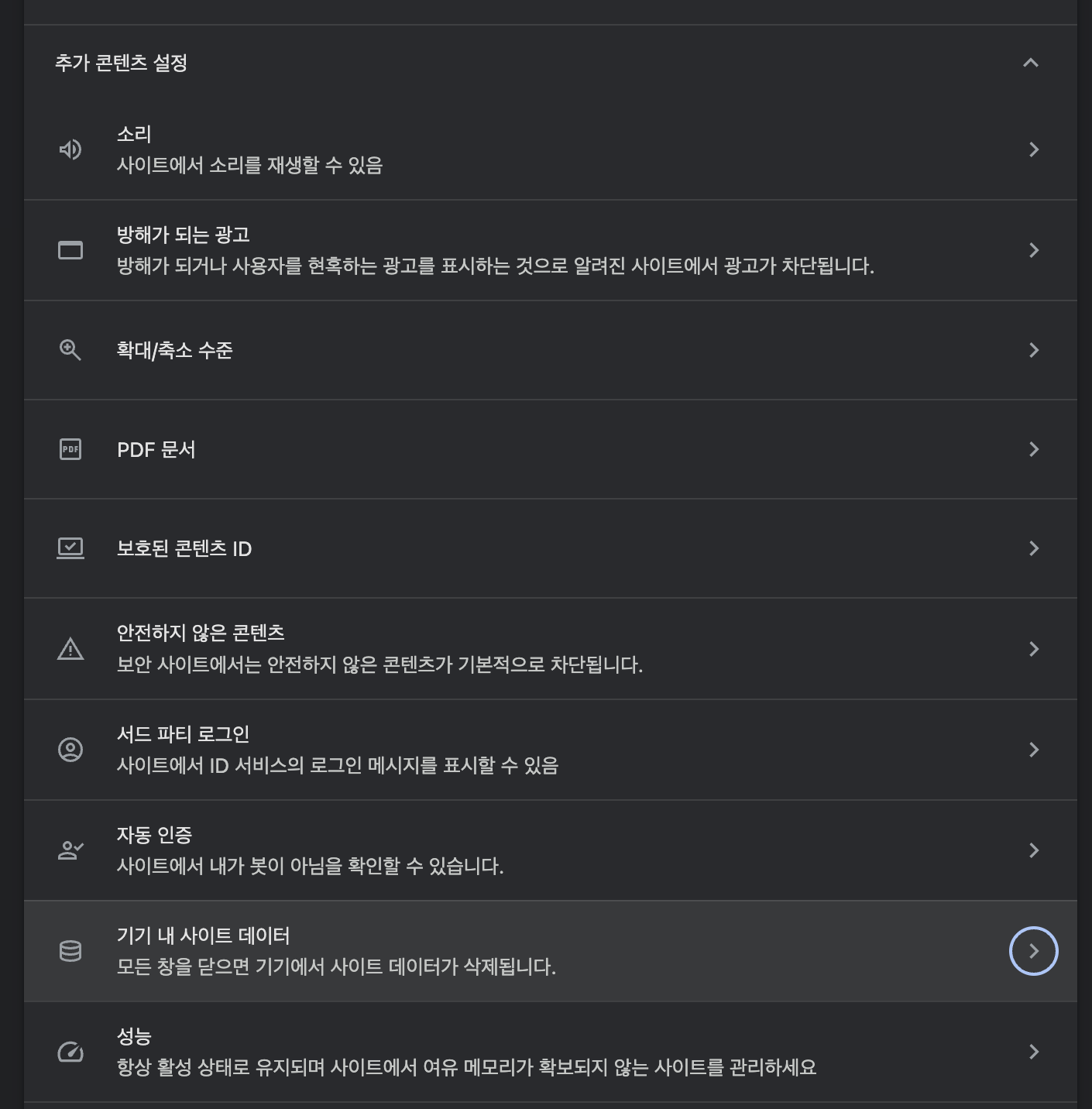 기기 내 사이트 데이터 > chrome://settings/content/siteData