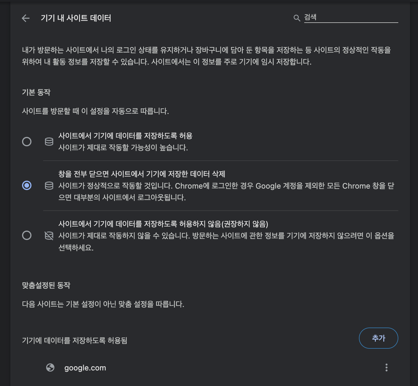 예전에 '모든 창이 닫히면 쿠키 및 사이트 데이터 삭제' 설정을 해서 크롬 창을 닫으면 쿠키 및 데이터가 다 삭제되도록 해서 사용해왔었는데